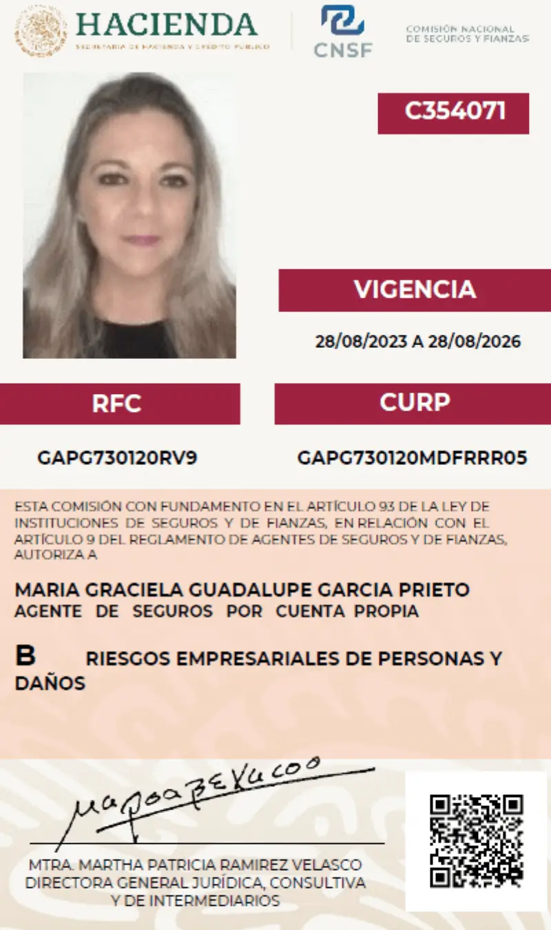Por medio de la presente le informo, que el suscrito María Graciela Guadalupe García Prieto es agente de seguros, con cédula número G354071, tipo B, expedida por la Comisión Nacional de Seguros y Fianzas, misma que le exhibo en original para mi debida identificación.