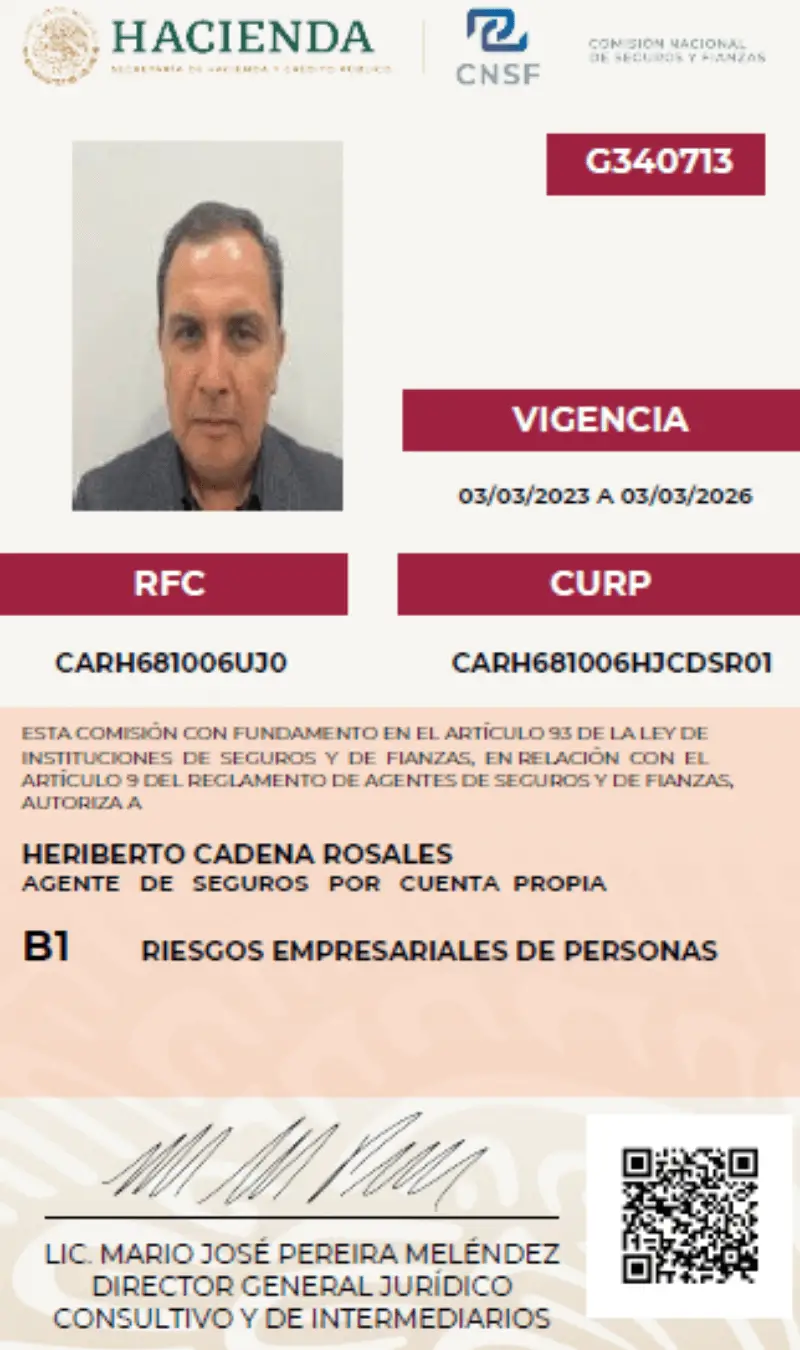 Por medio de la presente le informo, que el suscrito Heriberto Cadena Rosales es agente de seguros, con cédula número G340713, tipo B1, expedida por la Comisión Nacional de Seguros y Fianzas, misma que le exhibo en original para mi debida identificación.