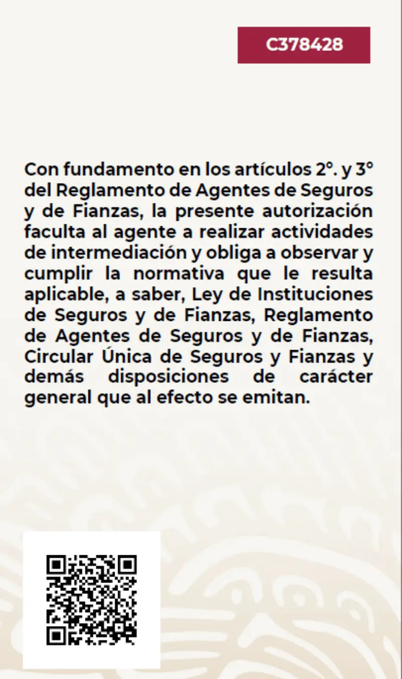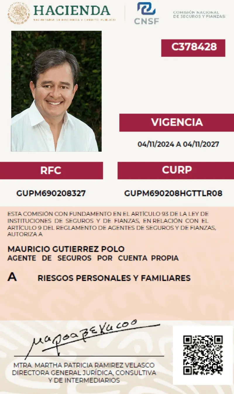 Por medio de la presente le informo, que el suscrito Mauricio Gutiérrez Polo es agente de seguros, con cédula número C378428, tipo A, expedida por la Comisión Nacional de Seguros y Fianzas, misma que le exhibo en original para mi debida identificación.